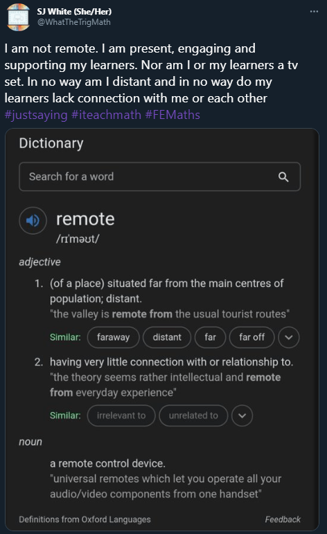 I’ve been sitting on this blog post for a while, wanting to have “completed” this enquiry before I share. However, remote teaching has put a bit of a spanner in the works so I need to consider how I’m going to pivot the enquiry to fit into current circumstances. Professor Kate Wall, from the University of Strathclyde, tweeted this a few weeks ago: